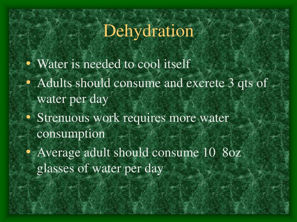 Dehydration • Water is needed to cool itself • Adults should consume and excrete 3 qts of water per day • Strenuous work requires more water consumption • Average adult should consume 10 8oz glasses of water per day