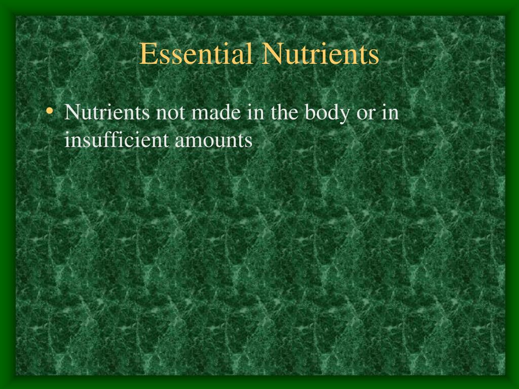 Essential Nutrients • Nutrients not made in the body or in insufficient amounts