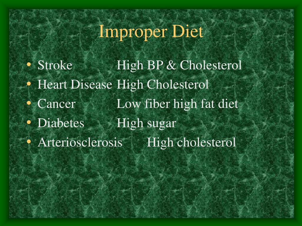 Improper Diet • Stroke High BP & Cholesterol • Heart Disease High Cholesterol • Cancer Low fiber high fat diet • Diabetes High sugar • Arteriosclerosis High cholesterol