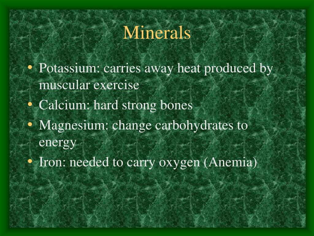 Minerals • Potassium: carries away heat produced by muscular exercise • Calcium: hard strong bones • Magnesium: change carbohydrates to energy • Iron: needed to carry oxygen (Anemia)