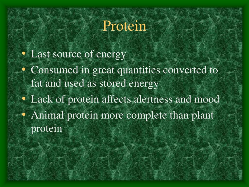 Protein • Last source of energy • Consumed in great quantities converted to fat and used as stored energy • Lack of protein affects alertness and mood • Animal protein more complete than plant protein