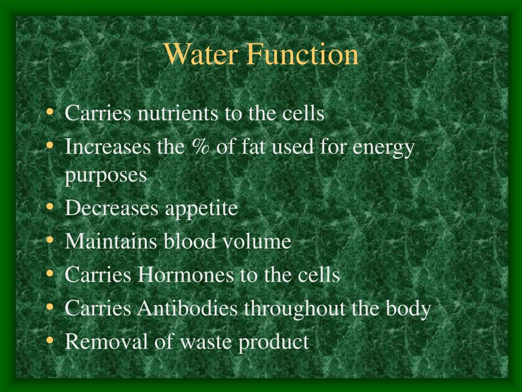 Water Function • Carries nutrients to the cells • Increases the % of fat used for energy purposes • Decreases appetite • Maintains blood volume • Carries Hormones to the cells • Carries Antibodies throughout the body • Removal of waste product