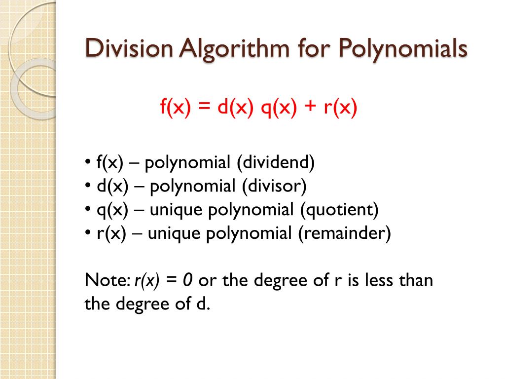 Division Algorithm for Polynomials • f(x) = d(x) q(x) + r(x) • f(x) – polynomial (dividend) • d(x) – polynomial (divisor) • q(x) – unique polynomial (quotient) • r(x) – unique polynomial (remainder) • Note: r(x) = 0 or the degree of r is less than the degree of d.