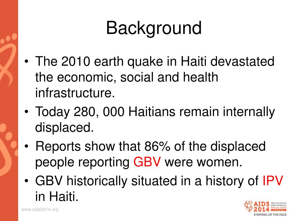 Background • The 2010 earth quake in Haiti devastated the economic, social and health infrastructure. • Today 280, 000 Haitians remain internally displaced. • Reports show that 86% of the displaced people reporting GBV were women. • GBV historically situated in a history of IPV in Haiti.
