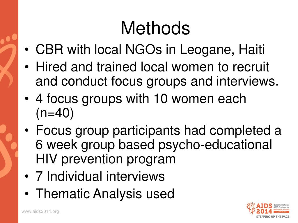 Methods • CBR with local NGOs in Leogane, Haiti • Hired and trained local women to recruit and conduct focus groups and interviews. • 4 focus groups with 10 women each (n=40) • Focus group participants had completed a 6 week group based psycho-educational HIV prevention program • 7 Individual interviews • Thematic Analysis used