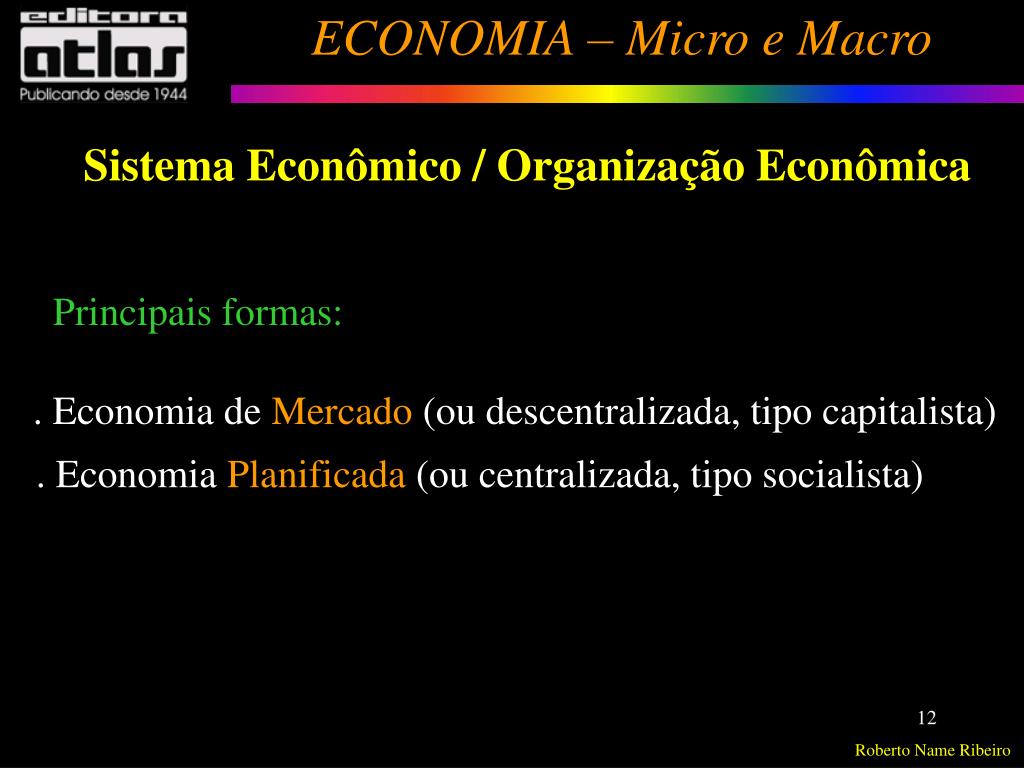 Sistema Econômico / Organização Econômica Principais formas: . Economia de Mercado (ou descentralizada, tipo capitalista) . Economia Planificada (ou centralizada, tipo socialista)