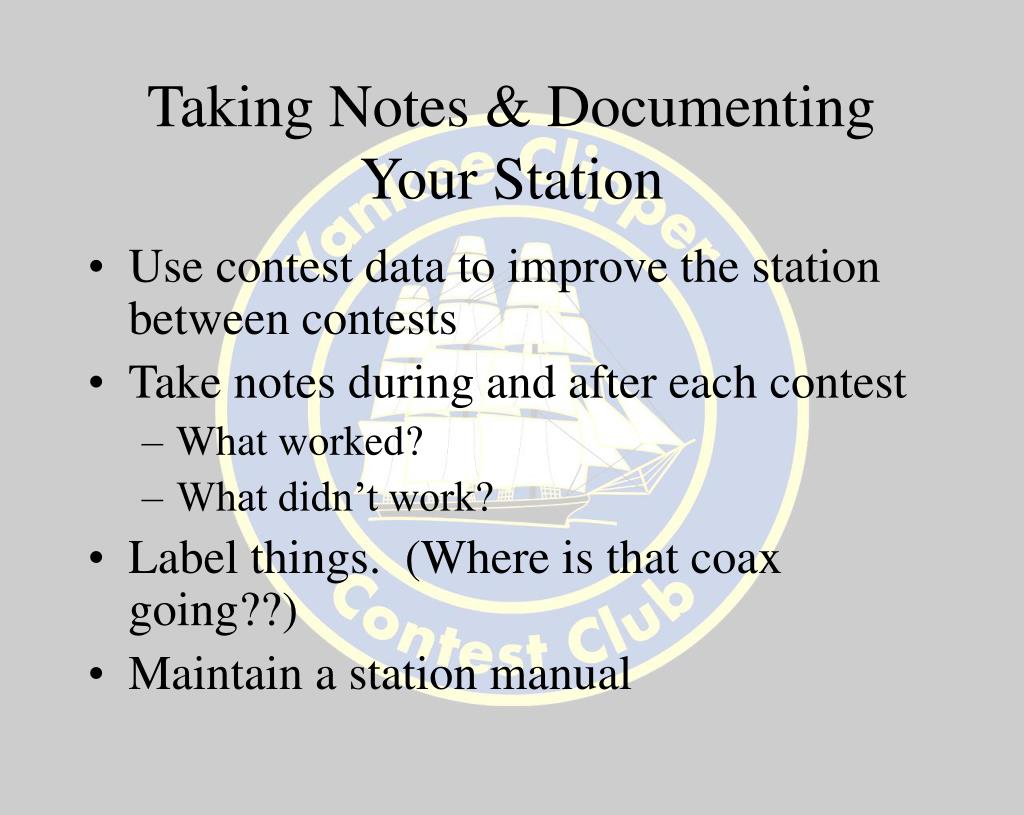 Taking Notes & Documenting Your Station • Use contest data to improve the station between contests • Take notes during and after each contest • What worked? • What didn’t work? • Label things. (Where is that coax going??) • Maintain a station manual