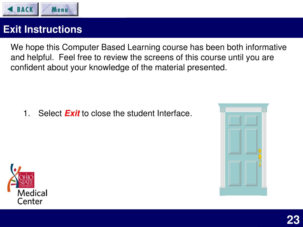 Exit Instructions We hope this Computer Based Learning course has been both informative and helpful. Feel free to review the screens of this course until you are confident about your knowledge of the material presented. Select Exitto close the student Interface.