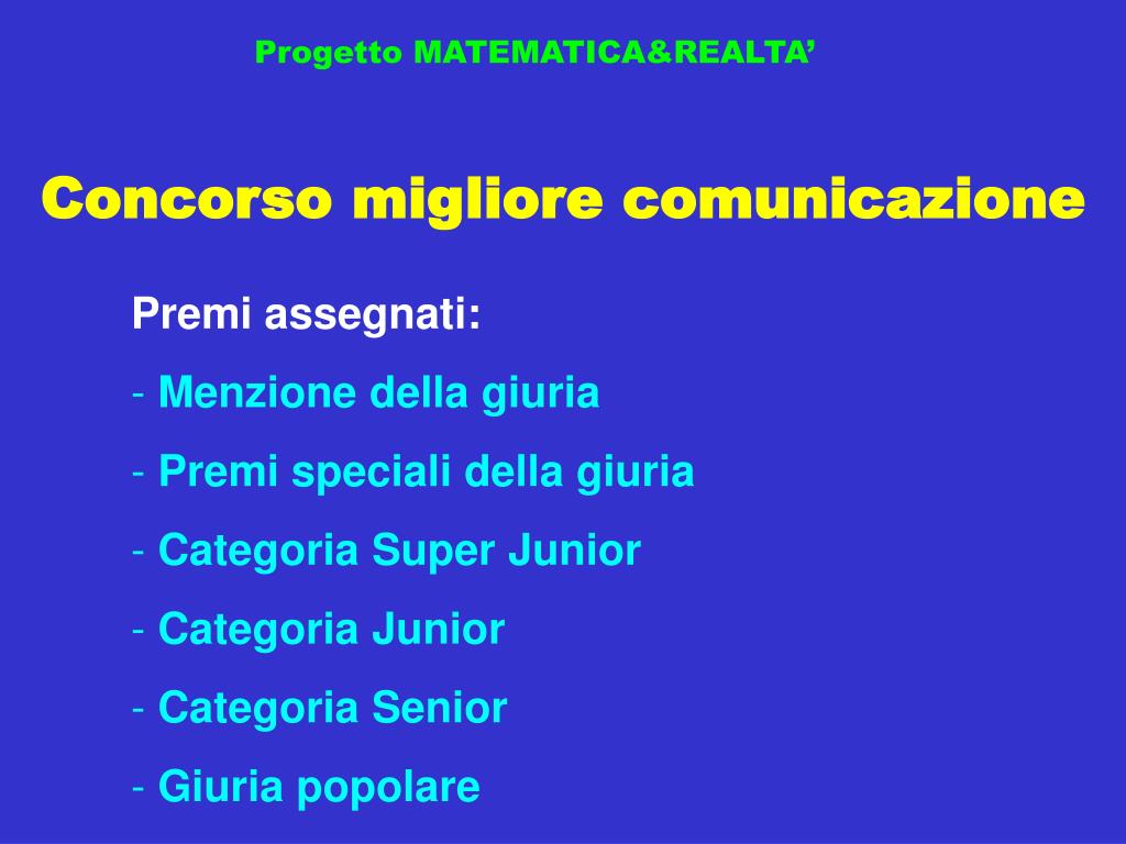 Progetto MATEMATICA&REALTA’ Concorso migliore comunicazione • Premi assegnati: • - Menzione della giuria • Premi speciali della giuria • Categoria Super Junior • Categoria Junior • Categoria Senior • Giuria popolare
