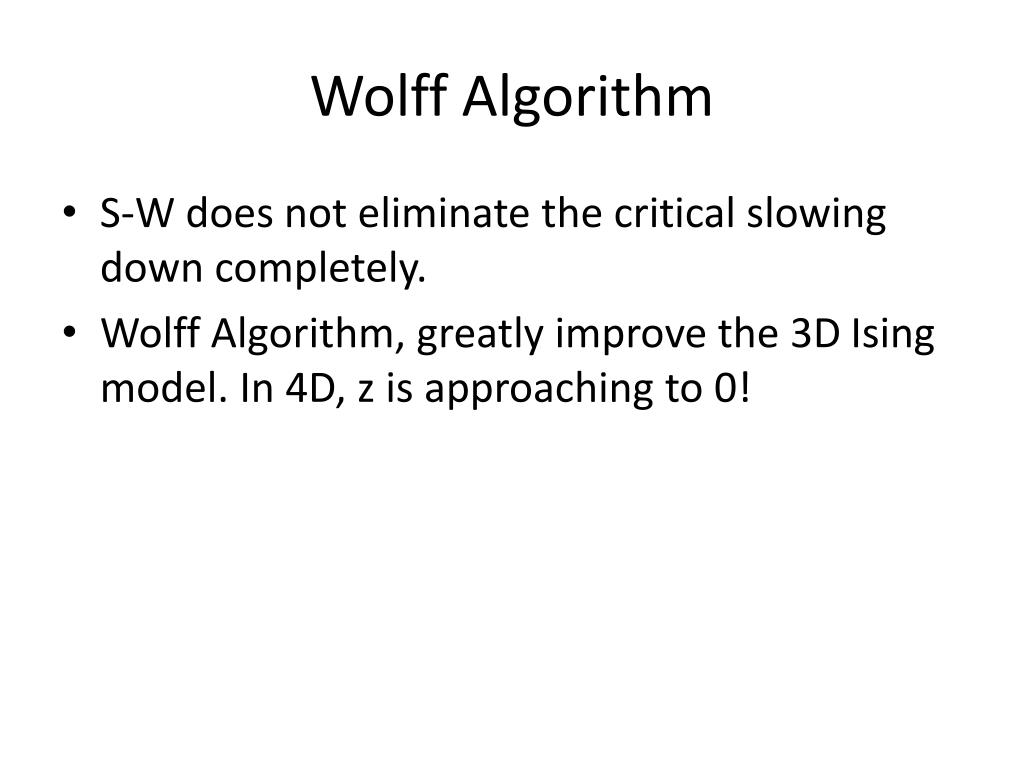 Wolff Algorithm • S-W does not eliminate the critical slowing down completely. • Wolff Algorithm, greatly improve the 3D Ising model. In 4D, z is approaching to 0!