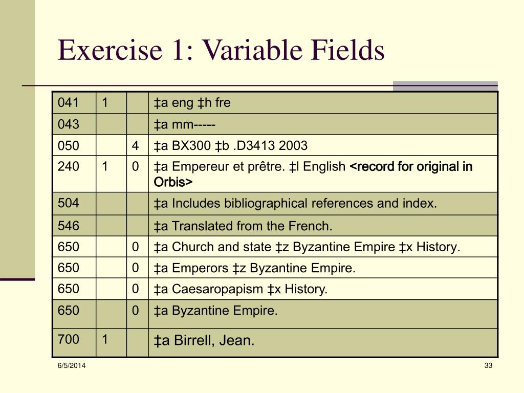 Exercises • For each exercise set, there will be a brief record and a list of variable fields • Assume the information in the brief record variable fields is correctly transcribed • Check off the variable/fixed fields that you would be required to add to a Core record • Provide appropriate tagging for highlighted fields (light purple) • Answers: Unrequired fields are highlighted