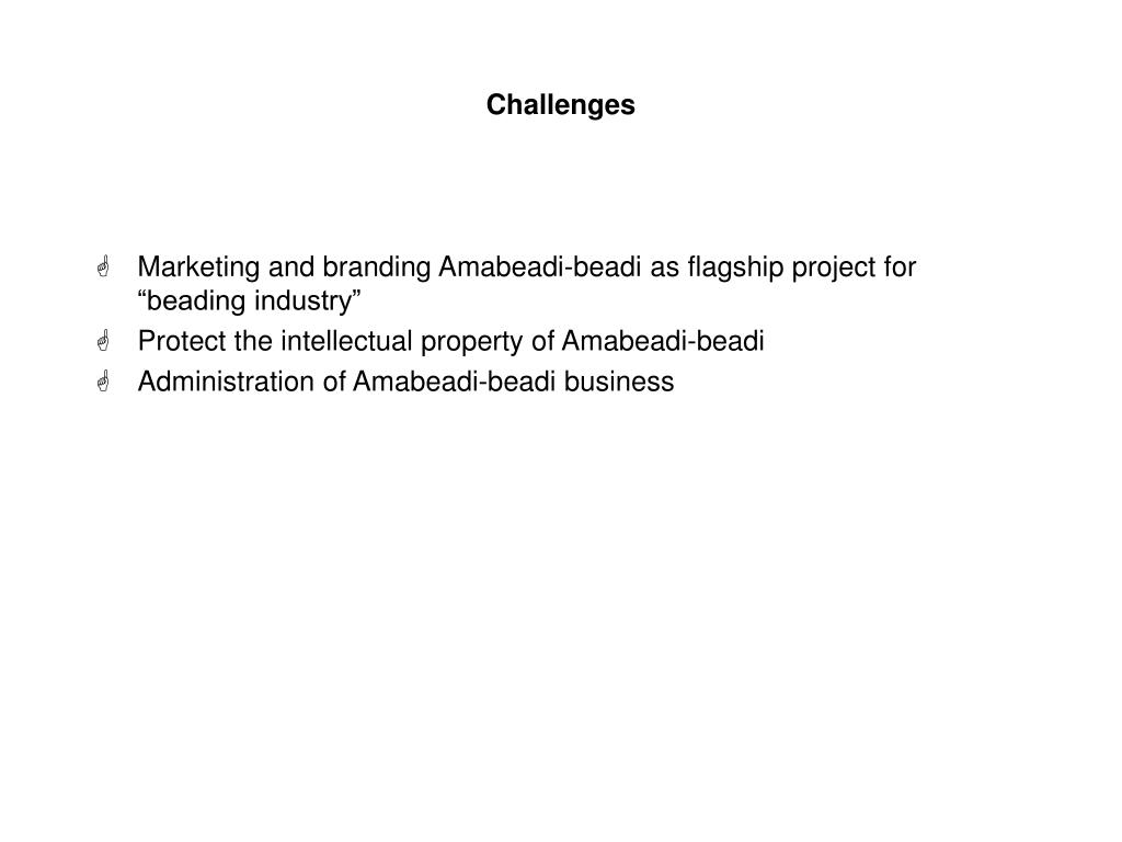 Challenges • Marketing and branding Amabeadi-beadi as flagship project for “beading industry” • Protect the intellectual property of Amabeadi-beadi • Administration of Amabeadi-beadi business