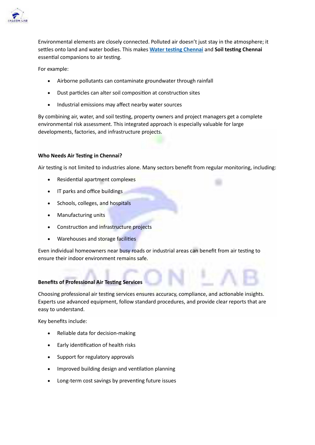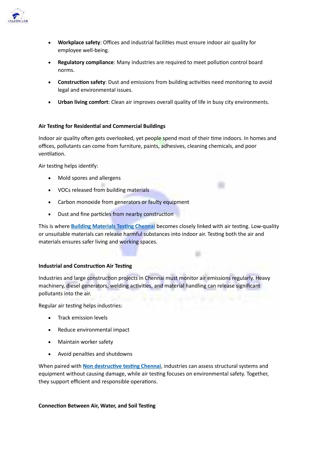 Air Testing Chennai| Falcon Industrial Testing Laboratory Air quality has become a serious concern for residents, businesses, and industries across Chennai. Rapid urban growth, heavy traffic, industrial zones, and ongoing construction have all contributed to rising pollution levels. Air Testing Chennai plays a crucial role in identifying harmful pollutants and helping people take informed steps to protect health and comply with regulations. When combined with Building Materials Testing Chennai, Water testing Chennai, Soil testing Chennai, and Non destructive testing Chennai, air testing offers a complete picture of environmental safety for any project or property. Chennai’s climate and geography make air testing especially important. High humidity, coastal winds, and dense urban activity can trap pollutants close to the ground. Without regular testing, poor air quality can quietly impact respiratory health, workplace productivity, and long-term structural safety. What Is Air Testing and How Does It Work? Air testing involves collecting and analyzing air samples to measure pollutants present in the environment. These pollutants may include particulate matter (PM2.5 and PM10), carbon monoxide, nitrogen dioxide, sulfur dioxide, volatile organic compounds (VOCs), and other hazardous substances. In Chennai, air testing is conducted in residential areas, commercial buildings, factories, construction sites, and outdoor locations. Specialists use calibrated instruments to collect accurate samples over a defined period. The results are then compared with national and international air quality standards to determine risk levels. Why Air Testing Is Essential in Chennai Air testing is not just about numbers on a report. It directly affects daily life and long-term safety. Some key reasons why air testing is critical include: • Health protection: Poor air quality can trigger asthma, allergies, headaches, and long-term respiratory diseases.