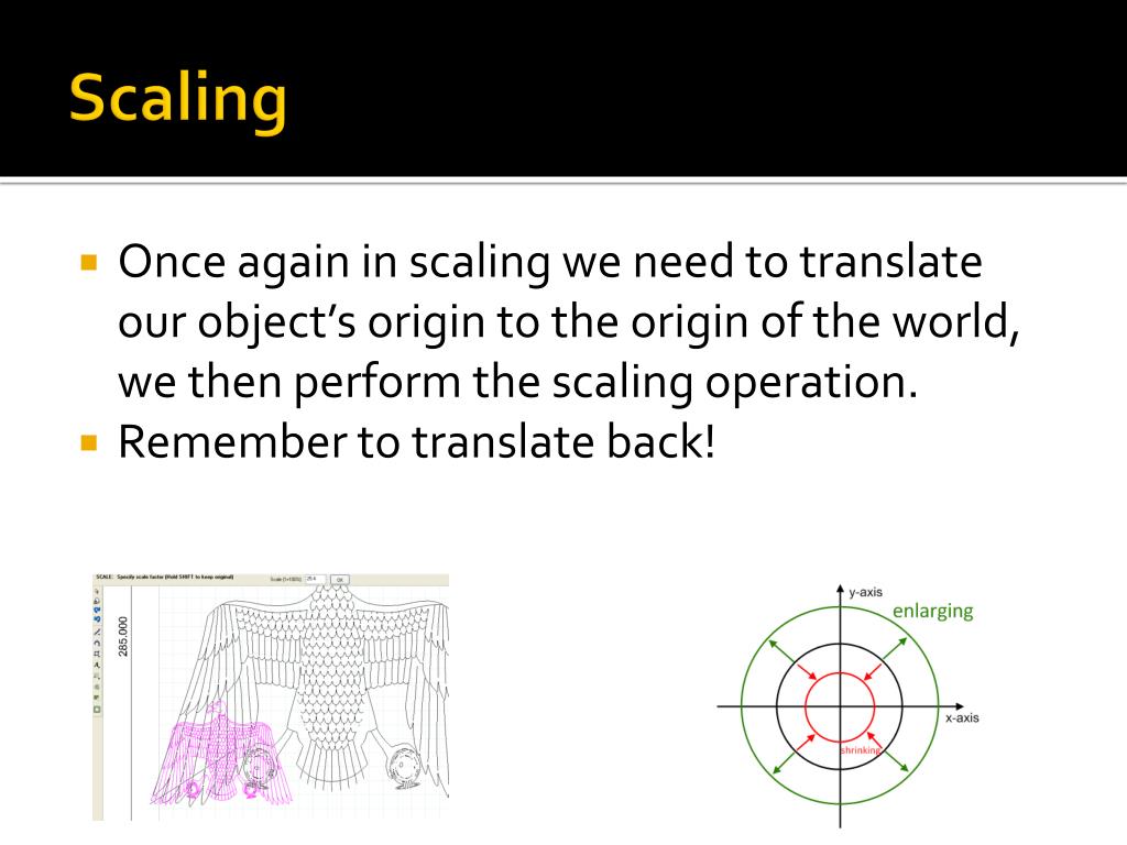 Scaling • Once again in scaling we need to translate our object’s origin to the origin of the world, we then perform the scaling operation. • Remember to translate back!