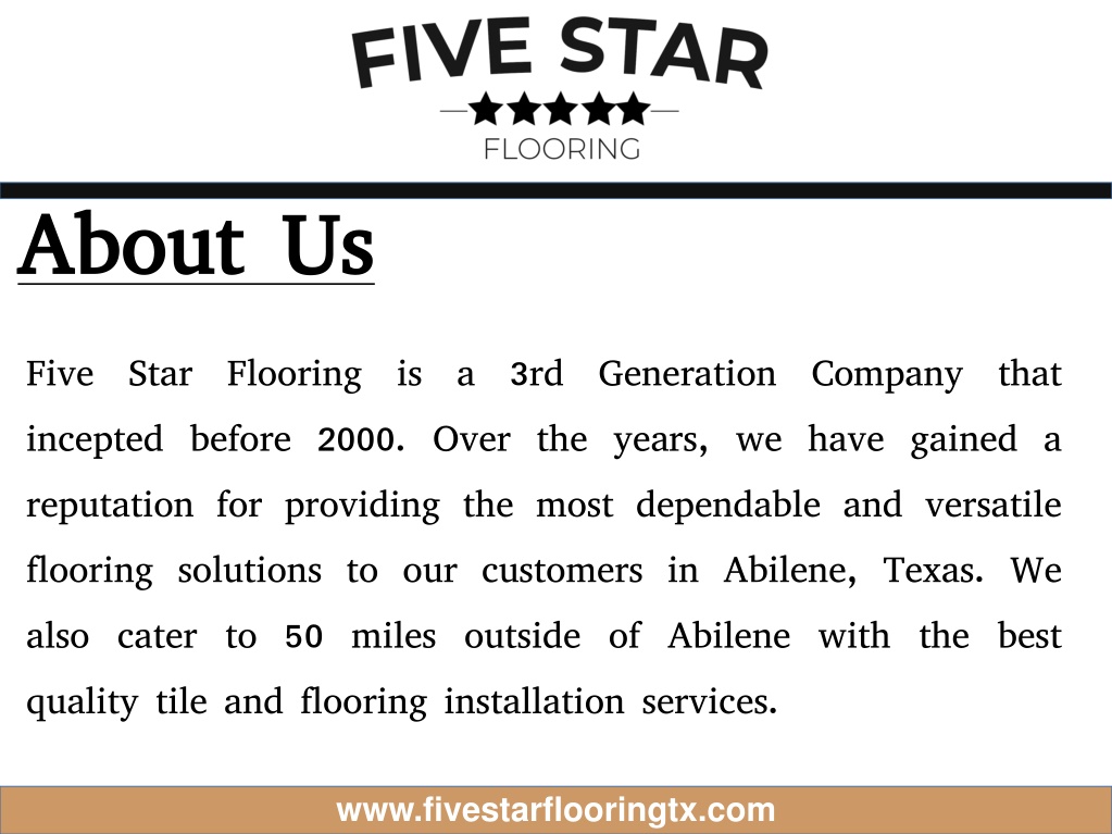About Us Five Star Flooring is a 3rd Generation Company that incepted before 2000. Over the years, we have gained a reputation for providing the most dependable and versatile flooring solutions to our customers in Abilene, Texas. We also cater to 50 miles outside of Abilene with the best quality tile and flooring installation services. www.fivestarflooringtx.com