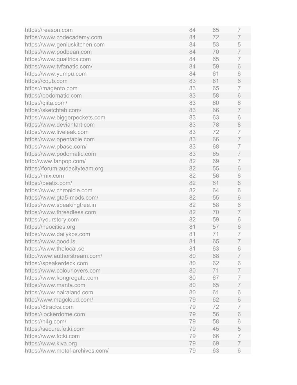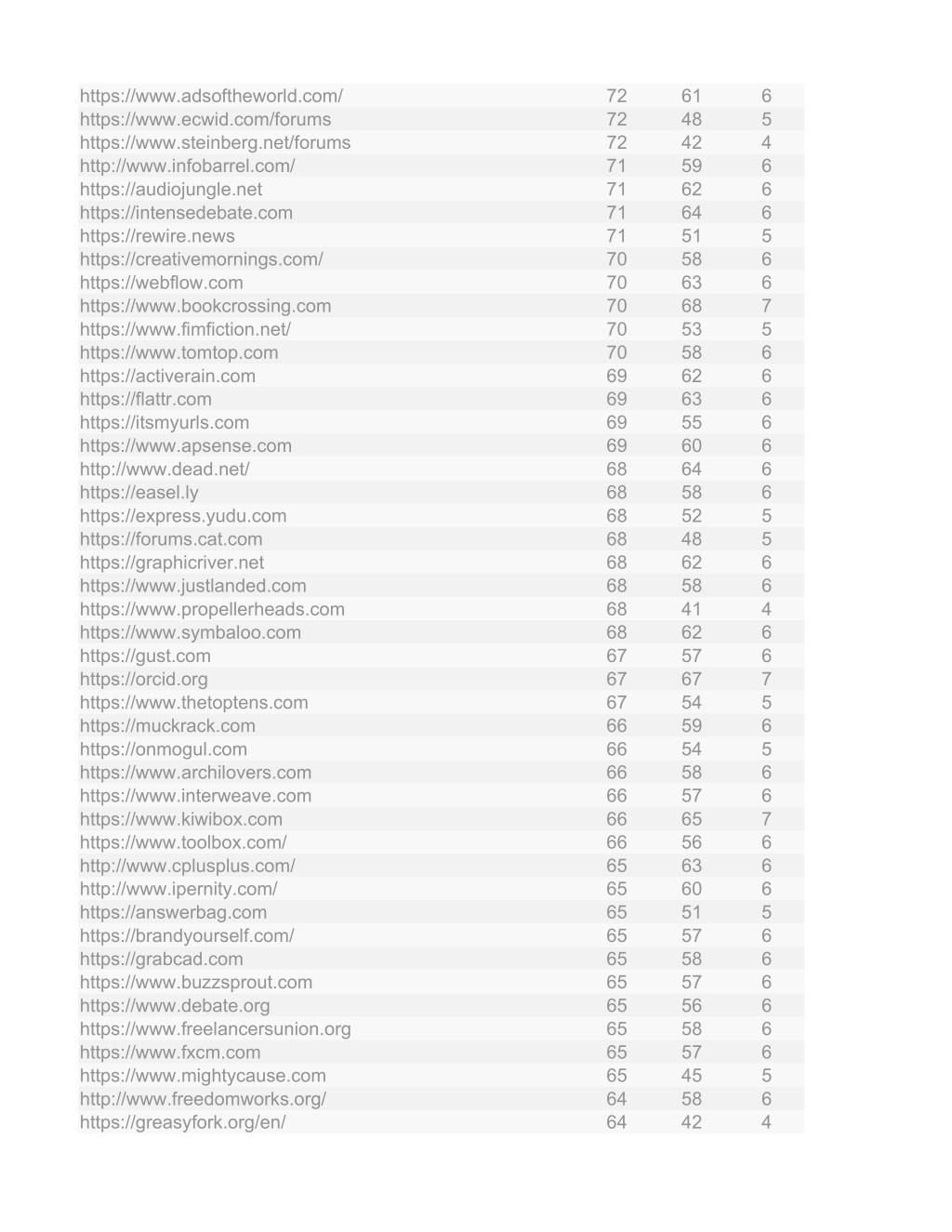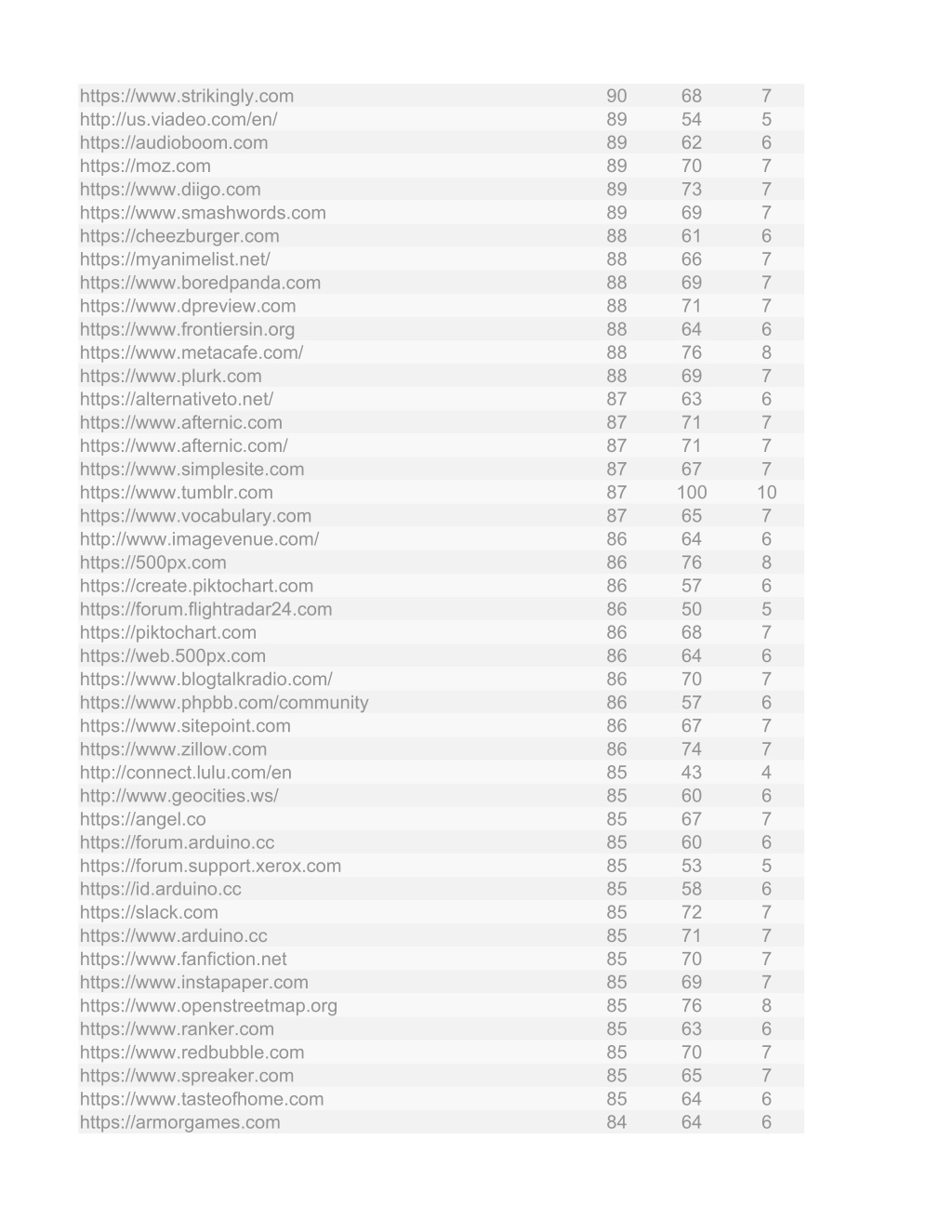 https://www.strikingly.com http://us.viadeo.com/en/ https://audioboom.com https://moz.com https://www.diigo.com https://www.smashwords.com https://cheezburger.com https://myanimelist.net/ https://www.boredpanda.com https://www.dpreview.com https://www.frontiersin.org https://www.metacafe.com/ https://www.plurk.com https://alternativeto.net/ https://www.afternic.com https://www.afternic.com/ https://www.simplesite.com https://www.tumblr.com https://www.vocabulary.com http://www.imagevenue.com/ https://500px.com https://create.piktochart.com https://forum.flightradar24.com https://piktochart.com https://web.500px.com https://www.blogtalkradio.com/ https://www.phpbb.com/community https://www.sitepoint.com https://www.zillow.com http://connect.lulu.com/en http://www.geocities.ws/ https://angel.co https://forum.arduino.cc https://forum.support.xerox.com https://id.arduino.cc https://slack.com https://www.arduino.cc https://www.fanfiction.net https://www.instapaper.com https://www.openstreetmap.org https://www.ranker.com https://www.redbubble.com https://www.spreaker.com https://www.tasteofhome.com https://armorgames.com 90 89 89 89 89 89 88 88 88 88 88 88 88 87 87 87 87 87 87 86 86 86 86 86 86 86 86 86 86 85 85 85 85 85 85 85 85 85 85 85 85 85 85 85 84 68 54 62 70 73 69 61 66 69 71 64 76 69 63 71 71 67 100 65 64 76 57 50 68 64 70 57 67 74 43 60 67 60 53 58 72 71 70 69 76 63 70 65 64 64 7 5 6 7 7 7 6 7 7 7 6 8 7 6 7 7 7 10 7 6 8 6 5 7 6 7 6 7 7 4 6 7 6 5 6 7 7 7 7 8 6 7 7 6 6