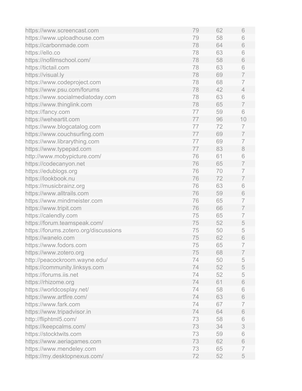 https://www.screencast.com https://www.uploadhouse.com https://carbonmade.com https://ello.co https://nofilmschool.com/ https://tictail.com https://visual.ly https://www.codeproject.com https://www.psu.com/forums https://www.socialmediatoday.com https://www.thinglink.com https://fancy.com https://weheartit.com https://www.blogcatalog.com https://www.couchsurfing.com https://www.librarything.com https://www.typepad.com http://www.mobypicture.com/ https://codecanyon.net https://edublogs.org https://lookbook.nu https://musicbrainz.org https://www.alltrails.com https://www.mindmeister.com https://www.tripit.com https://calendly.com https://forum.teamspeak.com/ https://forums.zotero.org/discussions https://wanelo.com https://www.fodors.com https://www.zotero.org http://peacockroom.wayne.edu/ https://community.linksys.com https://forums.iis.net https://rhizome.org https://worldcosplay.net/ https://www.artfire.com/ https://www.fark.com https://www.tripadvisor.in http://fliphtml5.com/ https://keepcalms.com/ https://stocktwits.com https://www.aeriagames.com https://www.mendeley.com https://my.desktopnexus.com/ 79 79 78 78 78 78 78 78 78 78 78 77 77 77 77 77 77 76 76 76 76 76 76 76 76 75 75 75 75 75 75 74 74 74 74 74 74 74 74 73 73 73 73 73 72 62 58 64 63 58 63 69 68 42 63 65 59 96 72 69 69 83 61 65 70 72 63 59 65 66 65 52 50 62 65 68 50 52 52 61 58 63 67 64 58 34 59 62 65 52 6 6 6 6 6 6 7 7 4 6 7 6 10 7 7 7 8 6 7 7 7 6 6 7 7 7 5 5 6 7 7 5 5 5 6 6 6 7 6 6 3 6 6 7 5
