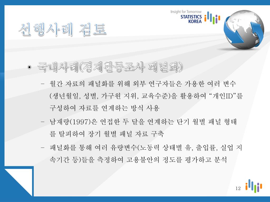선행사례 검토 • 국내사례(경제활동조사 패널화) • 월간 자료의 패널화를 위해 외부 연구자들은 가용한 여러 변수(생년월일, 성별, 가구원 지위, 교육수준)을 활용하여 “개인ID”를 구성하여 자료를 연계하는 방식 사용 • 남재량(1997)은 연접한 두 달을 연계하는 단기 월별 패널 형태를 탈피하여 장기 월별 패널 자료 구축 • 패널화를 통해 여러 유량변수(노동력 상태별 유, 출입률, 실업 지속기간 등)들을 측정하여 고용불안의 정도를 평가하고 분석