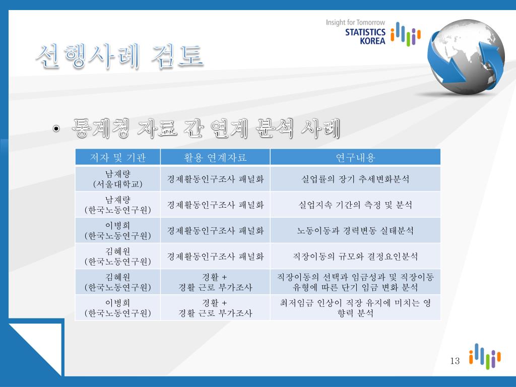 선행사례 검토 • 국내사례(경제활동조사 패널화) • 통계청은 마이크로 데이터를 외부 연구자에게 제공하지만 자료간 연계 자료를 제공하지 않으며, 개인 식별 및 자료 연계가 가능한 정보는 제공하지 않음 • 일부 연구자들은 통계청 데이터를 연계하여 분석과제를 수행 • 가장 대표적인 예가 경제활동인구조사 자료의 패널화 • 이를 통해 노동시장에서의 동태적 움직임 포착 가능