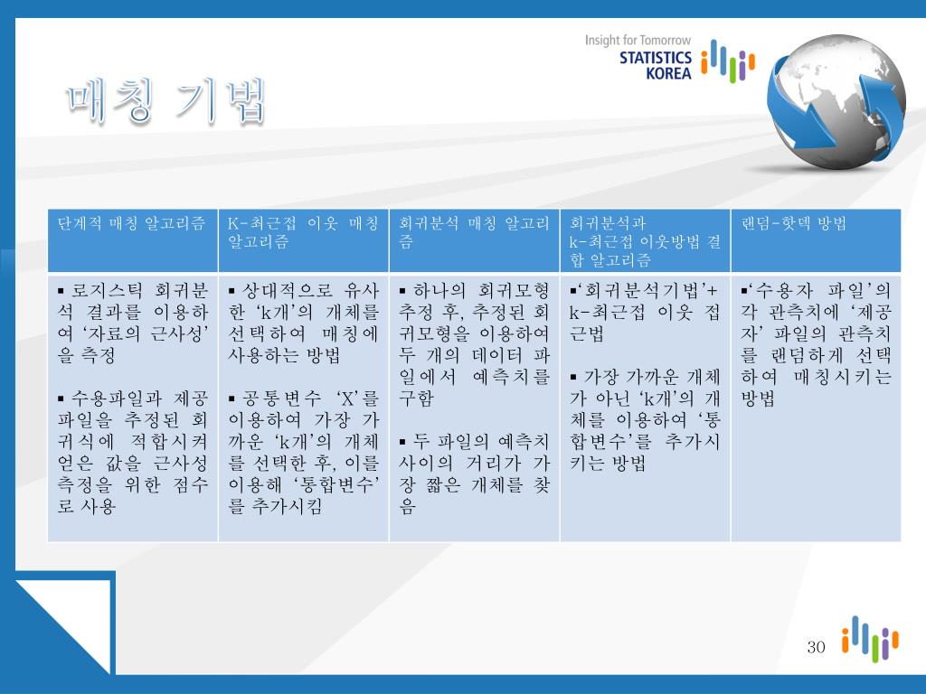 2 차 통계 생산 방안 - 가계 경활 연계 방안. 조사연구실 심규호 2011.10.19. 1. 2. 4. 목차. 연구 배경. 선행사례 및 전문가 수요조사. 매칭 기법 및 매칭 결과. 3. 결론 및 향후 방향. 연구배경. 통계청 작성 통계 하나의 자료 안에 수록된 정보는 제한적 신뢰도 높은 연구의 수행과 정책 수립을 위해서는 충분한 자료의 확보가 중요 하나의 자료에서 분석에 필요한 정보를 얻는 것은 어려운 일