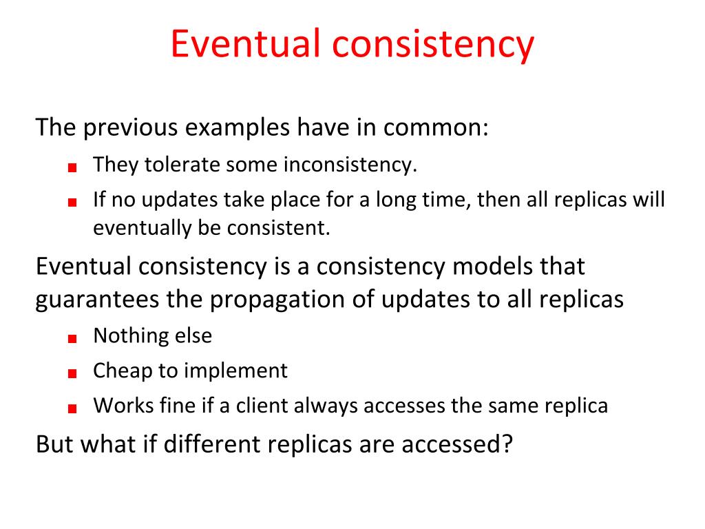 Eventual consistency • The previous examples have in common: • They tolerate some inconsistency. • If no updates take place for a long time, then all replicas will eventually be consistent. • Eventual consistency is a consistency models that guarantees the propagation of updates to all replicas • Nothing else • Cheap to implement • Works fine if a client always accesses the same replica • But what if different replicas are accessed?