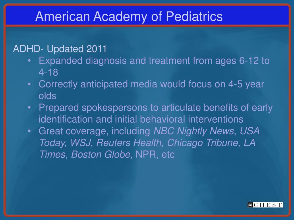 American Academy of Pediatrics • ADHD- Updated 2011 • Expanded diagnosis and treatment from ages 6-12 to 4-18 • Correctly anticipated media would focus on 4-5 year olds • Prepared spokespersons to articulate benefits of early identification and initial behavioral interventions • Great coverage, including NBC Nightly News, USA Today, WSJ, Reuters Health, Chicago Tribune, LA Times, Boston Globe, NPR, etc