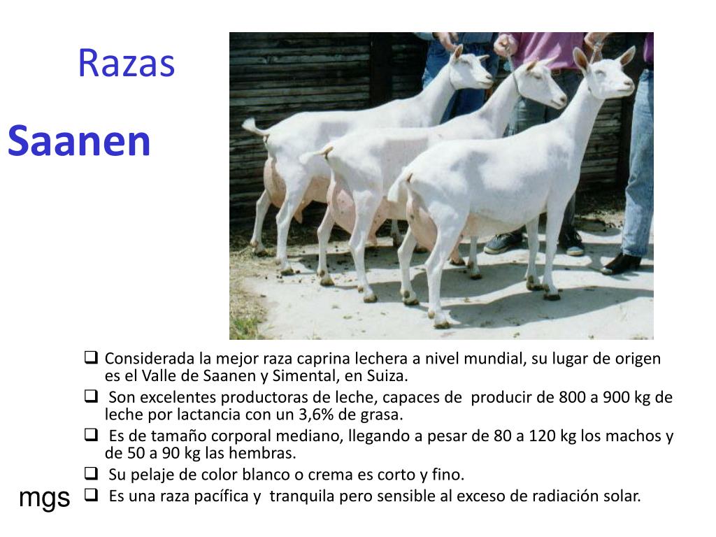 Razas Saanen • Considerada la mejor raza caprina lechera a nivel mundial, su lugar de origen es el Valle de Saanen y Simental, en Suiza. • Son excelentes productoras de leche, capaces de producir de 800 a 900 kg de leche por lactancia con un 3,6% de grasa. • Es de tamaño corporal mediano, llegando a pesar de 80 a 120 kg los machos y de 50 a 90 kg las hembras. • Su pelaje de color blanco o crema es corto y fino. • Es una raza pacífica y tranquila pero sensible al exceso de radiación solar. mgs