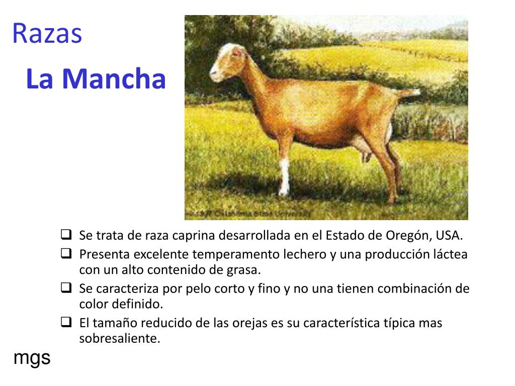 Razas La Mancha • Se trata de raza caprina desarrollada en el Estado de Oregón, USA. • Presenta excelente temperamento lechero y una producción láctea con un alto contenido de grasa. • Se caracteriza por pelo corto y fino y no una tienen combinación de color definido. • El tamaño reducido de las orejas es su característica típica mas sobresaliente. mgs