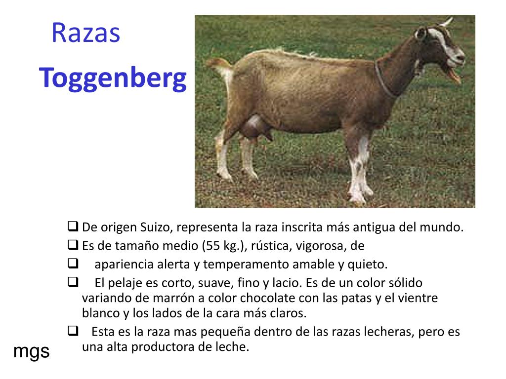 Razas Toggenberg • De origen Suizo, representa la raza inscrita más antigua del mundo. • Es de tamaño medio (55 kg.), rústica, vigorosa, de • apariencia alerta y temperamento amable y quieto. • El pelaje es corto, suave, fino y lacio. Es de un color sólido variando de marrón a color chocolate con las patas y el vientre blanco y los lados de la cara más claros. • Esta es la raza mas pequeña dentro de las razas lecheras, pero es una alta productora de leche. mgs