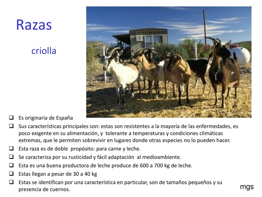 Razas criolla • Es originaria de España • Sus características principales son: estas son resistentes a la mayoría de las enfermedades, es poco exigente en su alimentación, y tolerante a temperaturas y condiciones climáticas extremas, que le permiten sobrevivir en lugares donde otras especies no lo pueden hacer. • Esta raza es de doble propósito: para carne y leche. • Se caracteriza por su rusticidad y fácil adaptación al medioambiente. • Esta es una buena productora de leche produce de 600 a 700 kg de leche. • Estas llegan a pesar de 30 a 40 kg • Estas se identifican por una característica en particular, son de tamaños pequeños y su presencia de cuernos. mgs