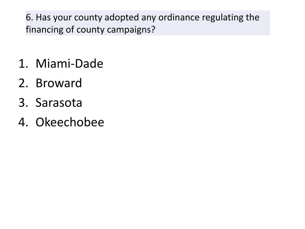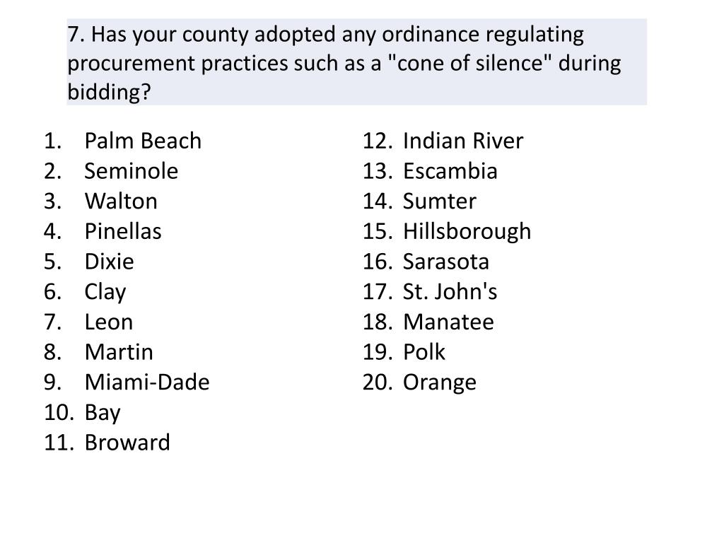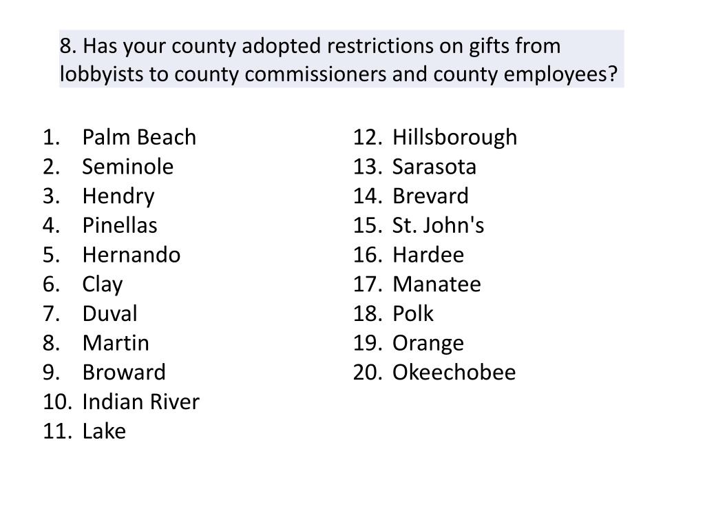 Palm Beach Seminole Clay Duval Miami-Dade Broward Indian River Lake Escambia Sarasota St. John's Orange. Palm Beach Duval Miami-Dade. Palm Beach Pinellas Duval Leon Miami-Dade Broward Lake Hillsborough Orange. Leon Okeechobee. Seminole Miami-Dade Hillsborough Orange