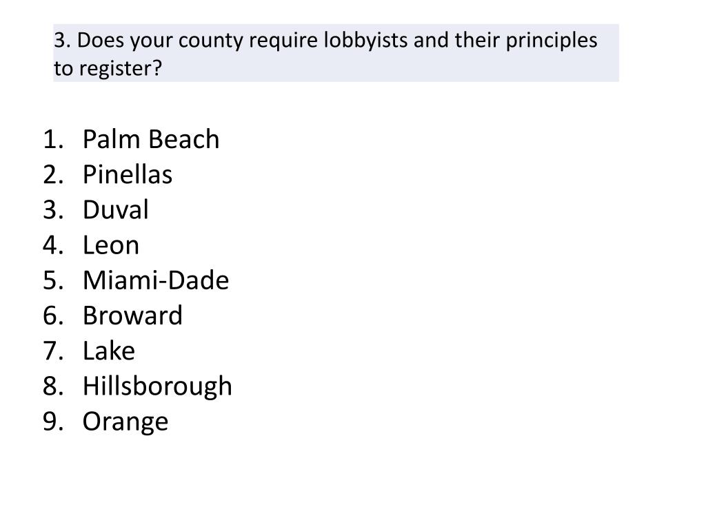 Palm Beach • Pinellas • Duval • Leon • Miami-Dade • Broward • Lake • Hillsborough • Orange