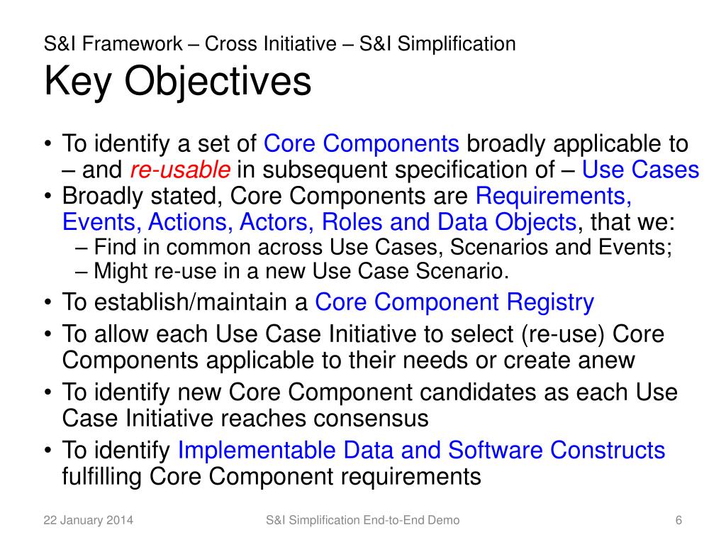 S&I Framework – Cross Initiative – S&I SimplificationKey Objectives • To identify a set of Core Components broadly applicable to – and re-usablein subsequent specification of– Use Cases • Broadly stated, Core Components are Requirements, Events, Actions, Actors, Roles and Data Objects, that we: • Find in common across Use Cases, Scenarios and Events; • Might re-use in a new Use Case Scenario. • To establish/maintain a Core Component Registry • To allow each Use Case Initiative to select (re-use) Core Components applicable to their needs or create anew • To identify new Core Component candidates as each Use Case Initiative reaches consensus • To identify Implementable Data and Software Constructsfulfilling Core Component requirements S&I Simplification End-to-End Demo