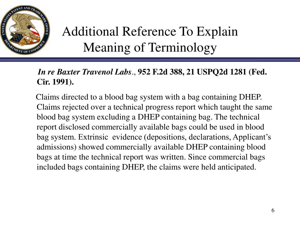 Additional Reference To Explain Meaning of Terminology In re Baxter Travenol Labs., 952 F.2d 388, 21 USPQ2d 1281 (Fed. Cir. 1991). Claims directed to a blood bag system with a bag containing DHEP. Claims rejected over a technical progress report which taught the same blood bag system excluding a DHEP containing bag. The technical report disclosed commercially available bags could be used in blood bag system. Extrinsic evidence (depositions, declarations, Applicant’s admissions) showed commercially available DHEP containing blood bags at time the technical report was written. Since commercial bags included bags containing DHEP, the claims were held anticipated.