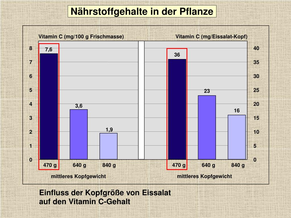 Vitamin C (mg/Eissalat-Kopf) 40 36 35 30 25 23 20 16 15 10 5 0 470 g 640 g 840 g mittleres Kopfgewicht Nährstoffgehalte in der Pflanze Vitamin C (mg/100 g Frischmasse) 8 7,6 7 6 5 4 3,6 3 1,9 2 1 0 470 g 640 g 840 g mittleres Kopfgewicht Einfluss der Kopfgröße von Eissalat auf den Vitamin C-Gehalt