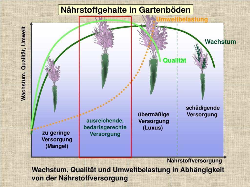 Nährstoffgehalte in Gartenböden Umweltbelastung Wachstum Qualität Wachstum, Qualität, Umwelt schädigende Versorgung übermäßige Versorgung (Luxus) ausreichende, bedarfsgerechte Versorgung zu geringe Versorgung (Mangel) Nährstoffversorgung Wachstum, Qualität und Umweltbelastung in Abhängigkeit von der Nährstoffversorgung