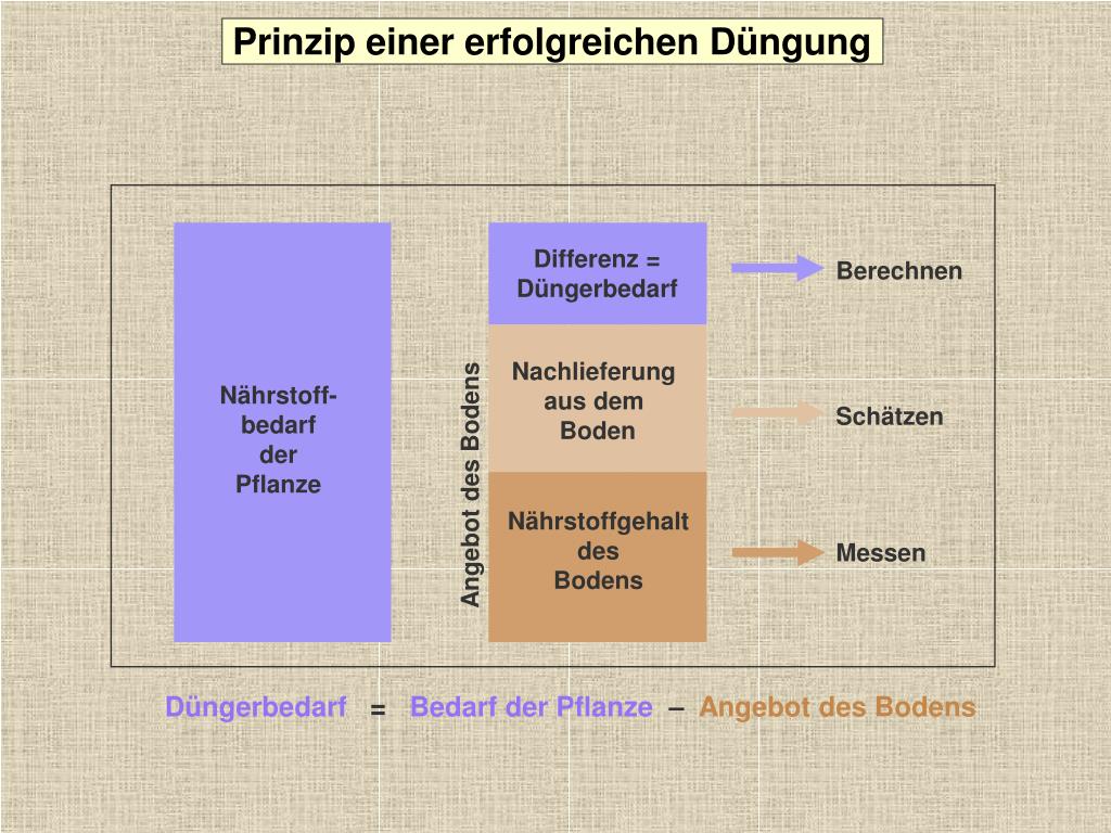 Differenz = Düngerbedarf Berechnen Nachlieferung aus dem Boden Nährstoff- bedarf der Pflanze Schätzen Nährstoffgehalt des Bodens Messen Prinzip einer erfolgreichen Düngung Angebot des Bodens Düngerbedarf = Bedarf der Pflanze – Angebot des Bodens