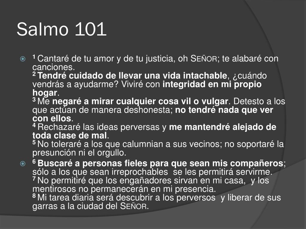 Salmo 101 • 1Cantaré de tu amor y de tu justicia, oh Señor; te alabaré con canciones.2 Tendré cuidado de llevar una vida intachable, ¿cuándo vendrás a ayudarme? Viviré con integridad en mi propio hogar.3 Me negaré a mirar cualquier cosa vil o vulgar. Detesto a los que actúan de manera deshonesta; no tendré nada que ver con ellos.4 Rechazaré las ideas perversas y me mantendré alejado de toda clase de mal.5 No toleraré a los que calumnian a sus vecinos; no soportaré la presunción ni el orgullo. • 6Buscaré a personas fieles para que sean mis compañeros; sólo a los que sean irreprochables se les permitirá servirme.7 No permitiré que los engañadores sirvan en mi casa, y los mentirosos no permanecerán en mi presencia.8 Mi tarea diaria será descubrir a los perversos y liberar de sus garras a la ciudad del Señor.