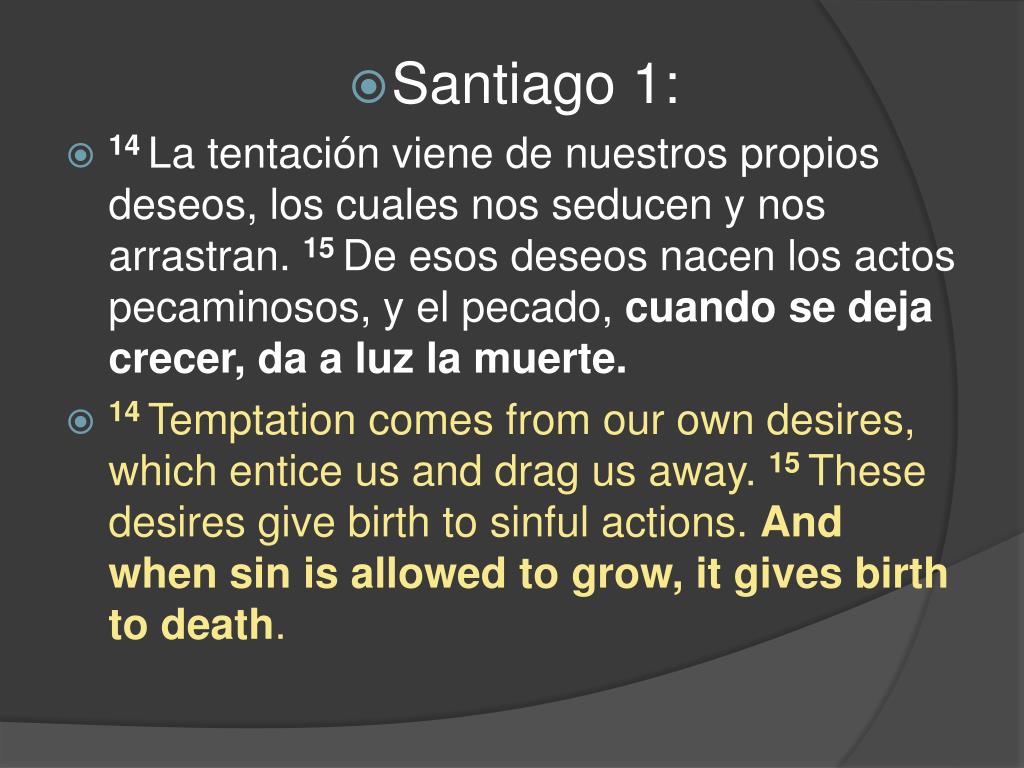Santiago 1: • 14La tentación viene de nuestros propios deseos, los cuales nos seducen y nos arrastran. 15 De esos deseos nacen los actos pecaminosos, y el pecado, cuando se deja crecer, da a luz la muerte. • 14 Temptation comes from our own desires, which entice us and drag us away. 15 These desires give birth to sinful actions. And when sin is allowed to grow, it gives birth to death.
