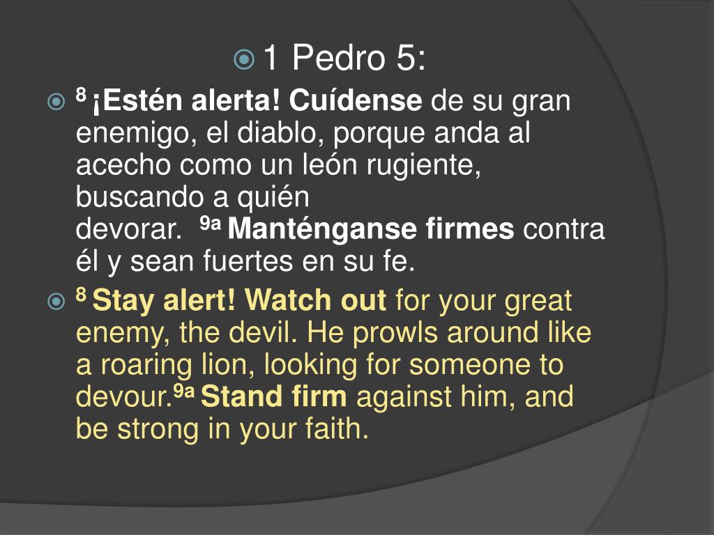 1 Pedro 5: • 8¡Estén alerta! Cuídense de su gran enemigo, el diablo, porque anda al acecho como un león rugiente, buscando a quién devorar. 9aManténganse firmes contra él y sean fuertes en su fe. • 8Stay alert! Watch out for your great enemy, the devil. He prowls around like a roaring lion, looking for someone to devour.9aStand firm against him, and be strong in your faith.