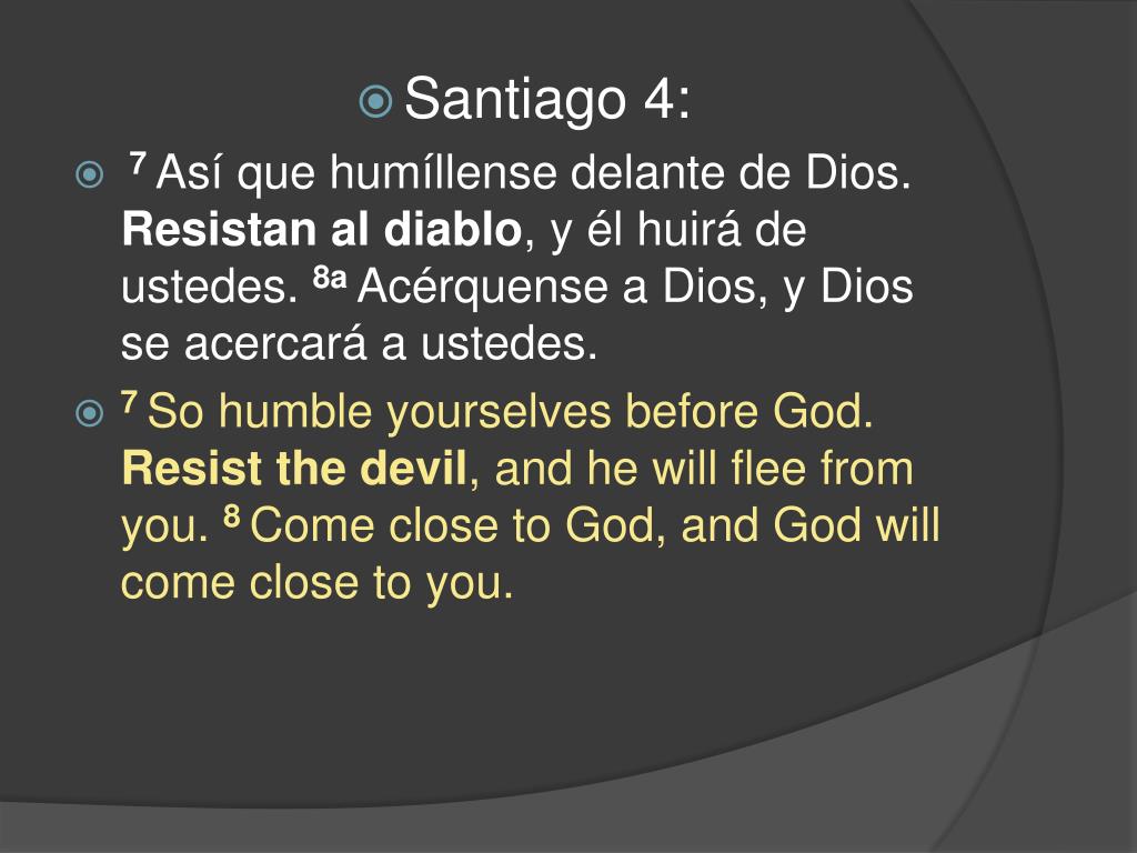 Santiago 4: • 7 Así que humíllense delante de Dios. Resistan al diablo, y él huirá de ustedes. 8a Acérquense a Dios, y Dios se acercará a ustedes. • 7 So humble yourselves before God. Resist the devil, and he will flee from you. 8 Come close to God, and God will come close to you.