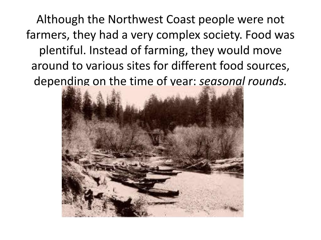 Although the Northwest Coast people were not farmers, they had a very complex society. Food was plentiful. Instead of farming, they would move around to various sites for different food sources, depending on the time of year: seasonal rounds.