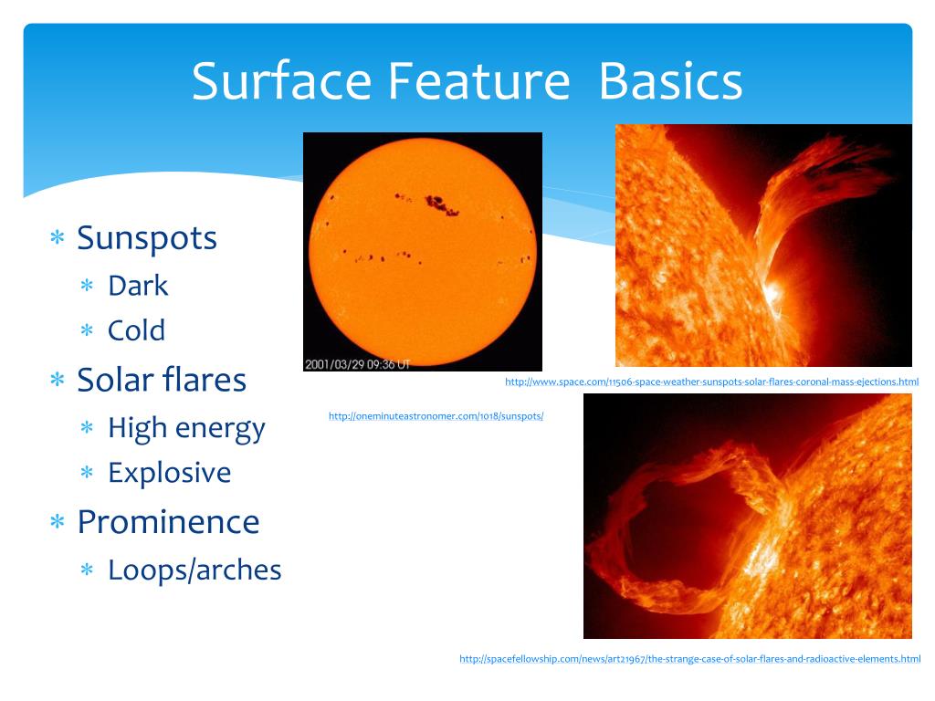 Surface Feature Basics http://www.space.com/11506-space-weather-sunspots-solar-flares-coronal-mass-ejections.html http://oneminuteastronomer.com/1018/sunspots/ • Sunspots • Dark • Cold • Solar flares • High energy • Explosive • Prominence • Loops/arches http://spacefellowship.com/news/art21967/the-strange-case-of-solar-flares-and-radioactive-elements.html