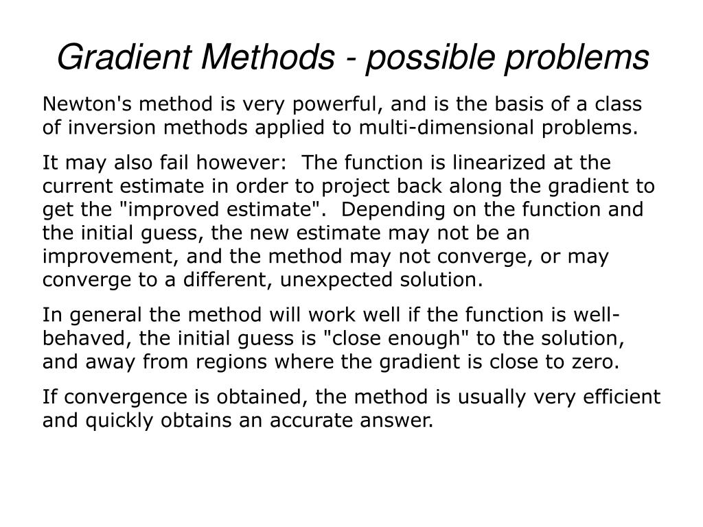 Gradient Methods - possible problems Newton's method is very powerful, and is the basis of a class of inversion methods applied to multi-dimensional problems. It may also fail however: The function is linearized at the current estimate in order to project back along the gradient to get the "improved estimate". Depending on the function and the initial guess, the new estimate may not be an improvement, and the method may not converge, or may converge to a different, unexpected solution. In general the method will work well if the function is well-behaved, the initial guess is "close enough" to the solution, and away from regions where the gradient is close to zero. If convergence is obtained, the method is usually very efficient and quickly obtains an accurate answer.