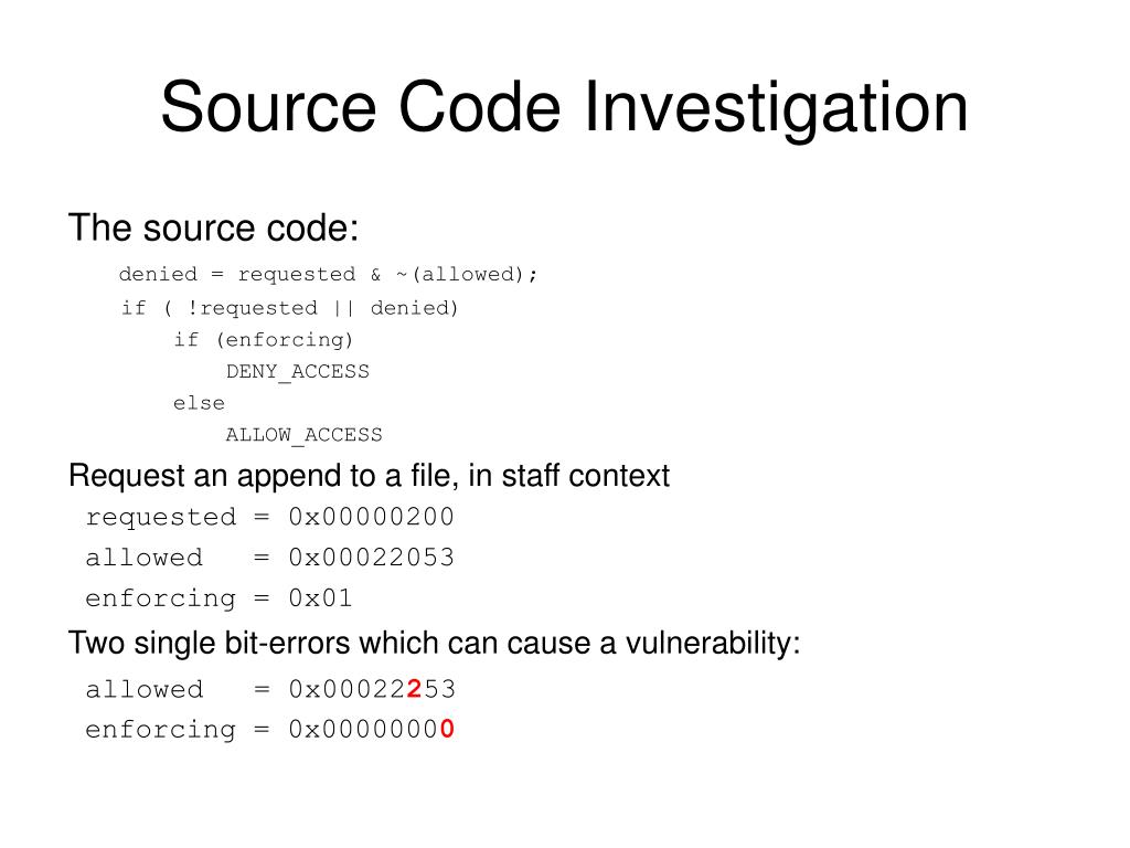 Source Code Investigation The source code: denied = requested & ~(allowed); if ( !requested || denied) if (enforcing) DENY_ACCESS else ALLOW_ACCESS Request an append to a file, in staff context requested = 0x00000200 allowed = 0x00022053 enforcing = 0x01 Two single bit-errors which can cause a vulnerability: allowed = 0x00022253 enforcing = 0x00000000
