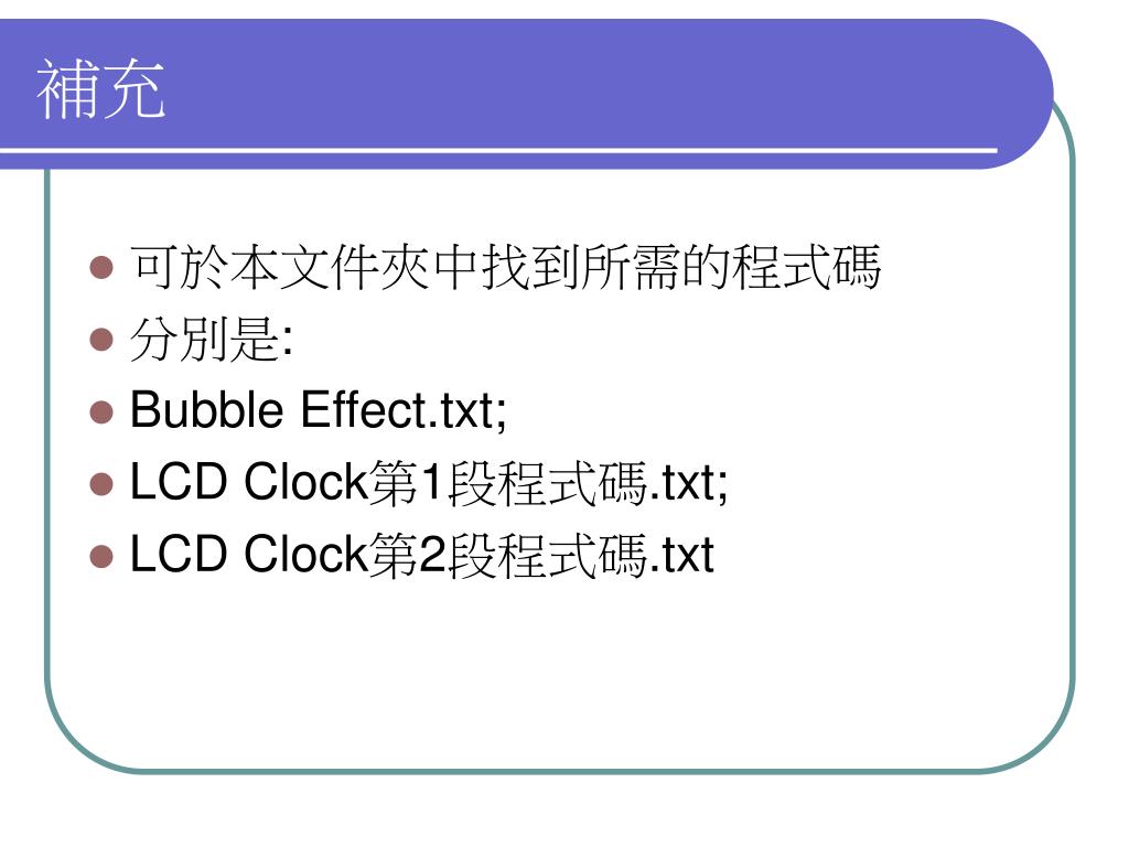 補充 • 可於本文件夾中找到所需的程式碼 • 分別是: • Bubble Effect.txt; • LCD Clock第1段程式碼.txt; • LCD Clock第2段程式碼.txt