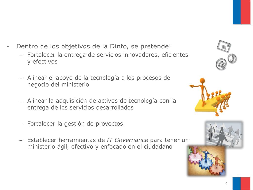 Dentro de los objetivos de la Dinfo, se pretende: • Fortalecer la entrega de servicios innovadores, eficientes y efectivos • Alinear el apoyo de la tecnología a los procesos de negocio del ministerio • Alinear la adquisición de activos de tecnología con la entrega de los servicios desarrollados • Fortalecer la gestión de proyectos • Establecer herramientas de IT Governance para tener un ministerio ágil, efectivo y enfocado en el ciudadano