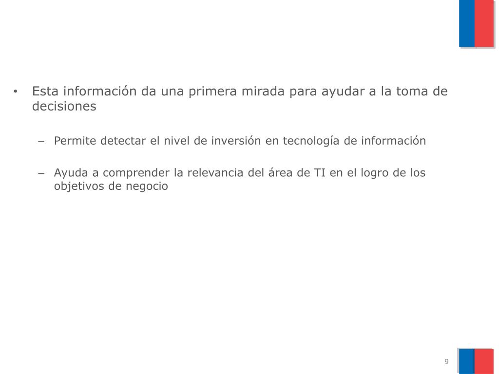Esta información da una primera mirada para ayudar a la toma de decisiones • Permite detectar el nivel de inversión en tecnología de información • Ayuda a comprender la relevancia del área de TI en el logro de los objetivos de negocio