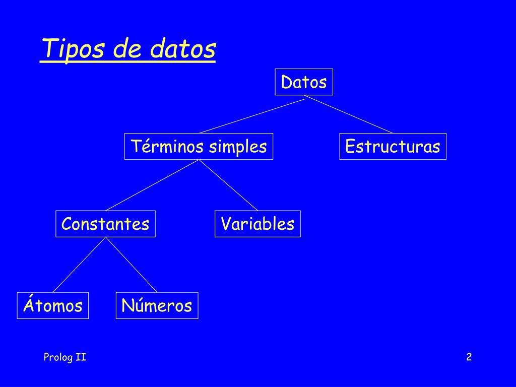 Tipos de datos Datos Términos simples Estructuras Constantes Variables Átomos Números Prolog II