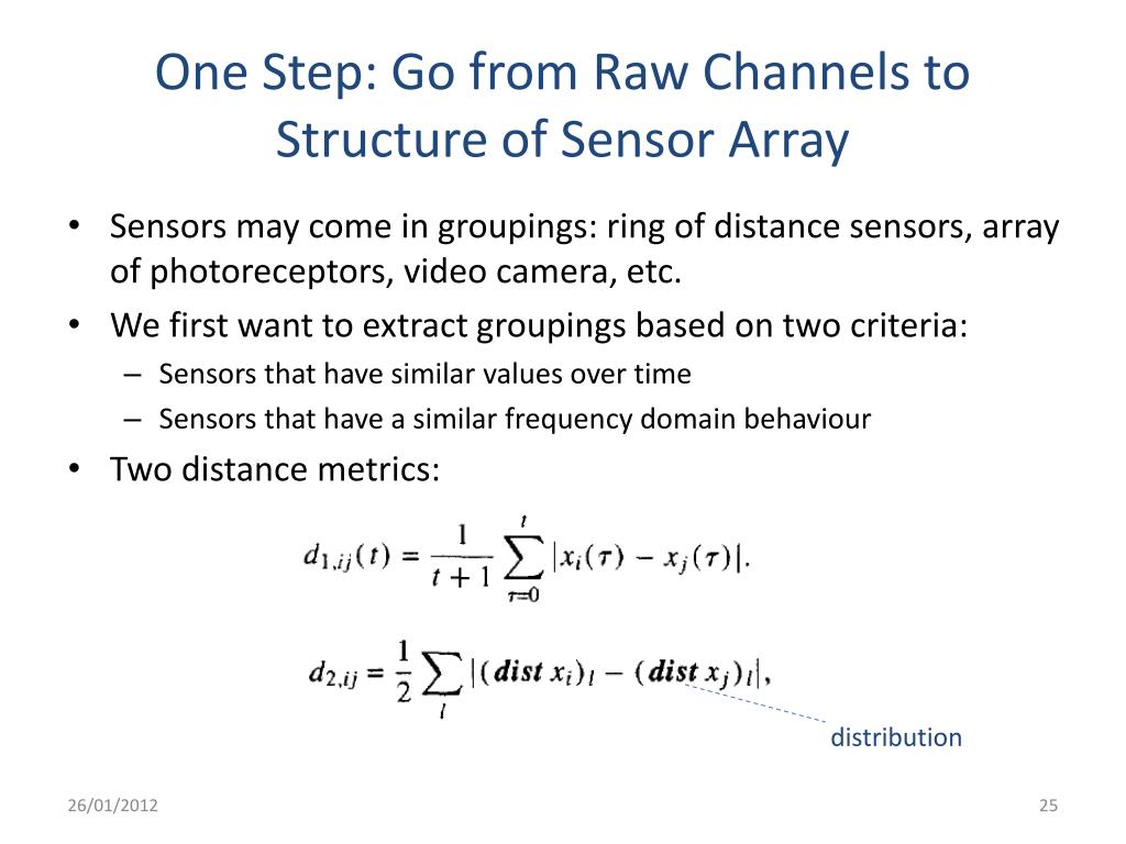 One Step: Go from Raw Channels to Structure of Sensor Array • Sensors may come in groupings: ring of distance sensors, array of photoreceptors, video camera, etc. • We first want to extract groupings based on two criteria: • Sensors that have similar values over time • Sensors that have a similar frequency domain behaviour • Two distance metrics: distribution